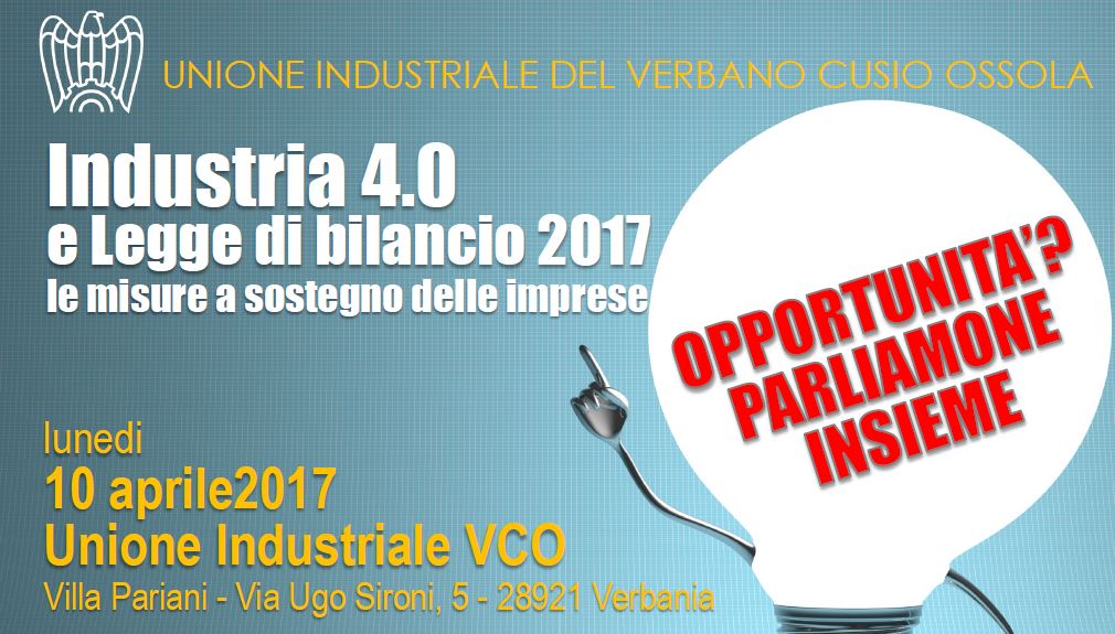 Alle ore 9,15 la presentazione della Legge di Bilancio 2017, in tema di Industria 4.0 e le misure a sostegno delle imprese, con il dott. Andrea Giraudo – consulente tecnico di Robinson s.r.l. – e il Rag. Riccardo Petroni – consulente fiscale di Unione Industriale del Verbano Cusio Ossola.
