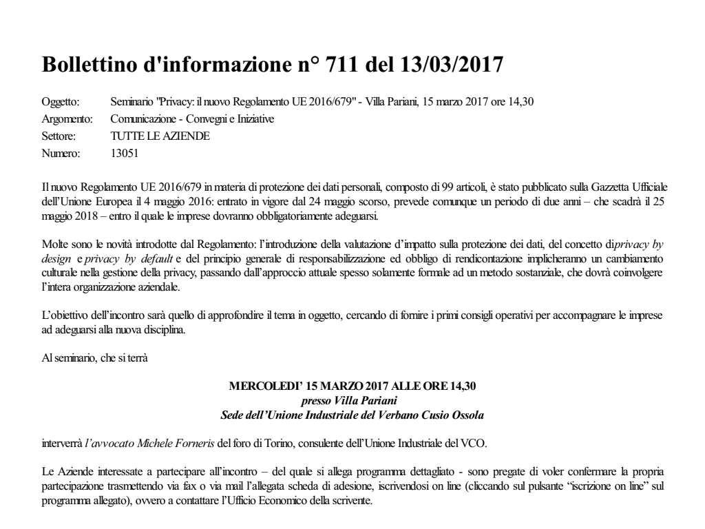 Documentazione seminario "Privacy: il nuovo Regolamento UE 2016/679"
