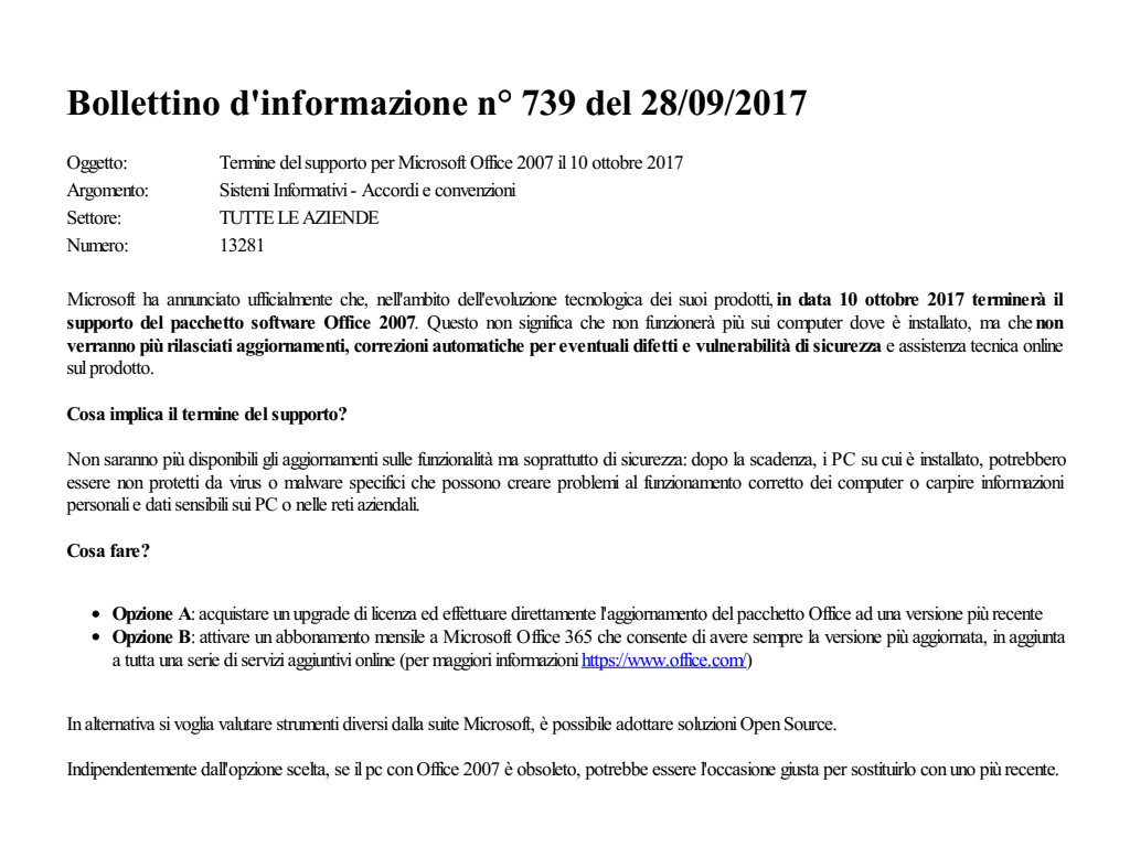 Termine del supporto per Microsoft Office 2007 il 10 ottobre 2017
