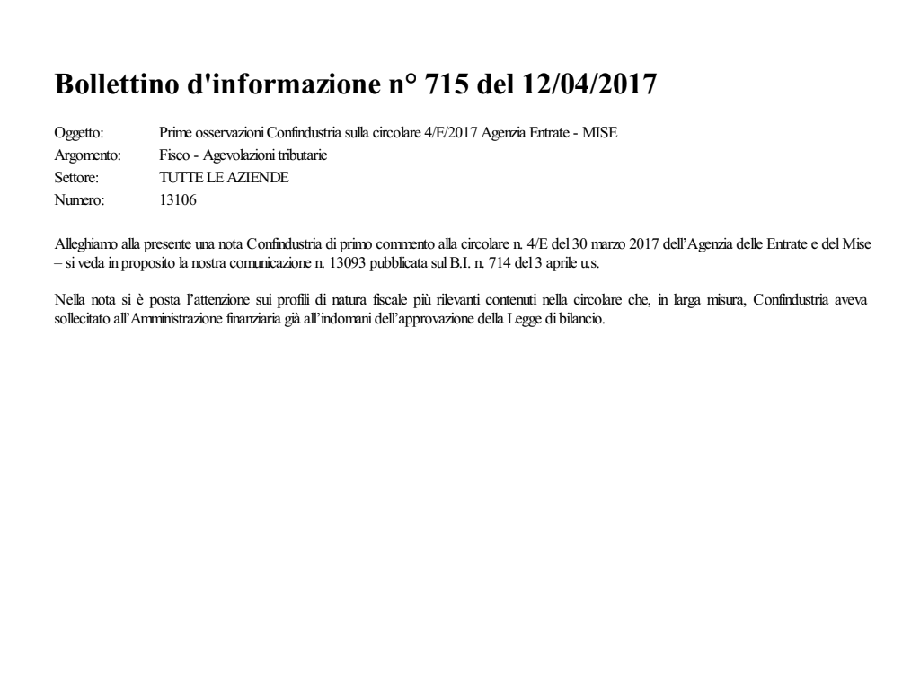 Prime osservazioni Confindustria sulla circolare 4/E/2017 Agenzia Entrate - MISE
