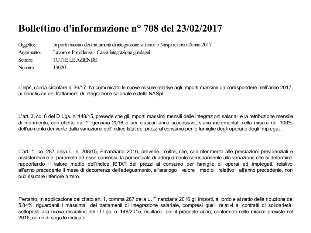 Importi massimi dei trattamenti di integrazione salariale e Naspi relativi all'anno 2017
