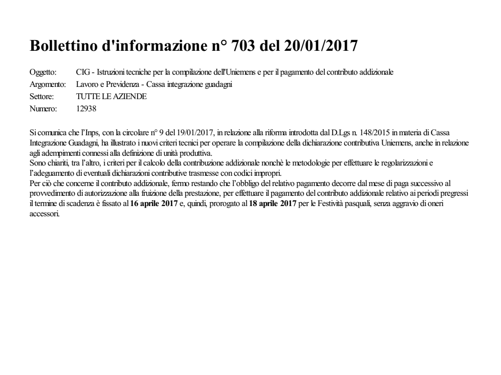 CIG - Istruzioni tecniche per la compilazione dell'Uniemens e per il pagamento del contributo addizionale
