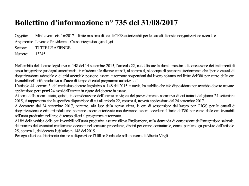 Min.Lavoro: cir. 16/2017 – limite massimo di ore di CIGS autorizzabili per le causali di crisi e riorganizzazione aziendale
