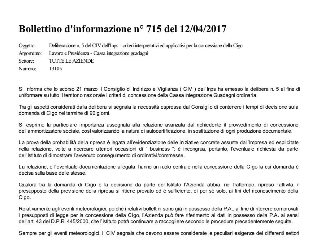 Deliberazione n. 5 del CIV dell'Inps - criteri interpretativi ed applicativi per la concessione della Cigo