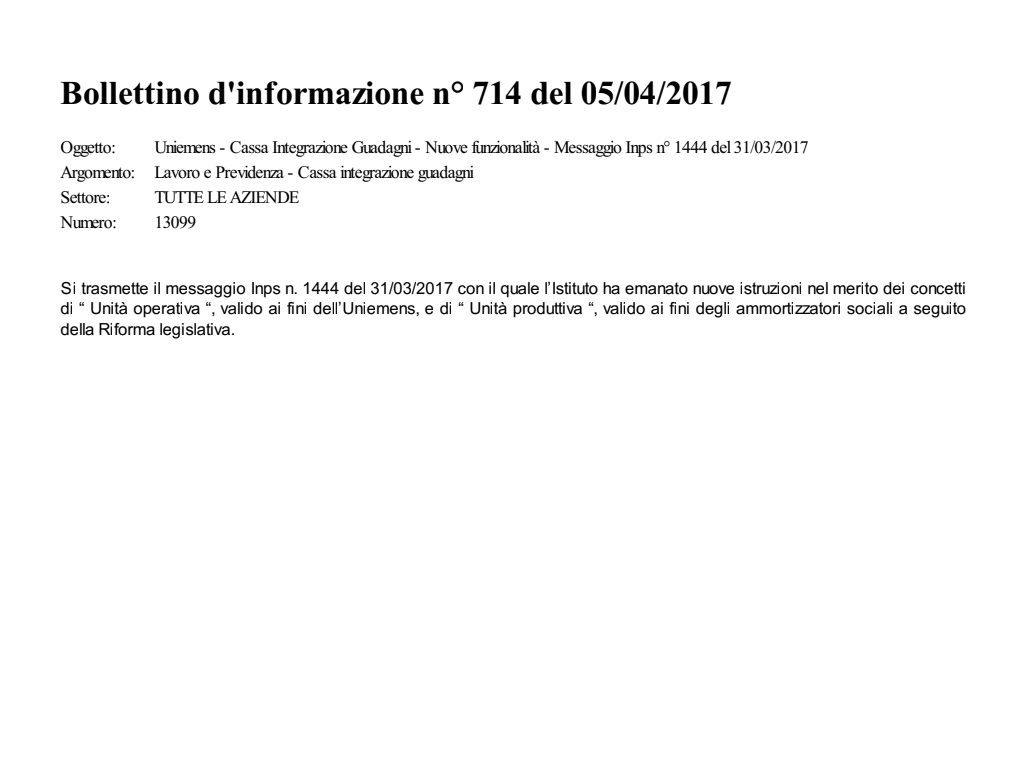 Uniemens - Cassa Integrazione Guadagni - Nuove funzionalità - Messaggio Inps n° 1444 del 31/03/2017