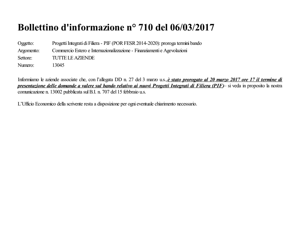 Progetti Integrati di Filiera - PIF (POR FESR 2014-2020): proroga termini bando