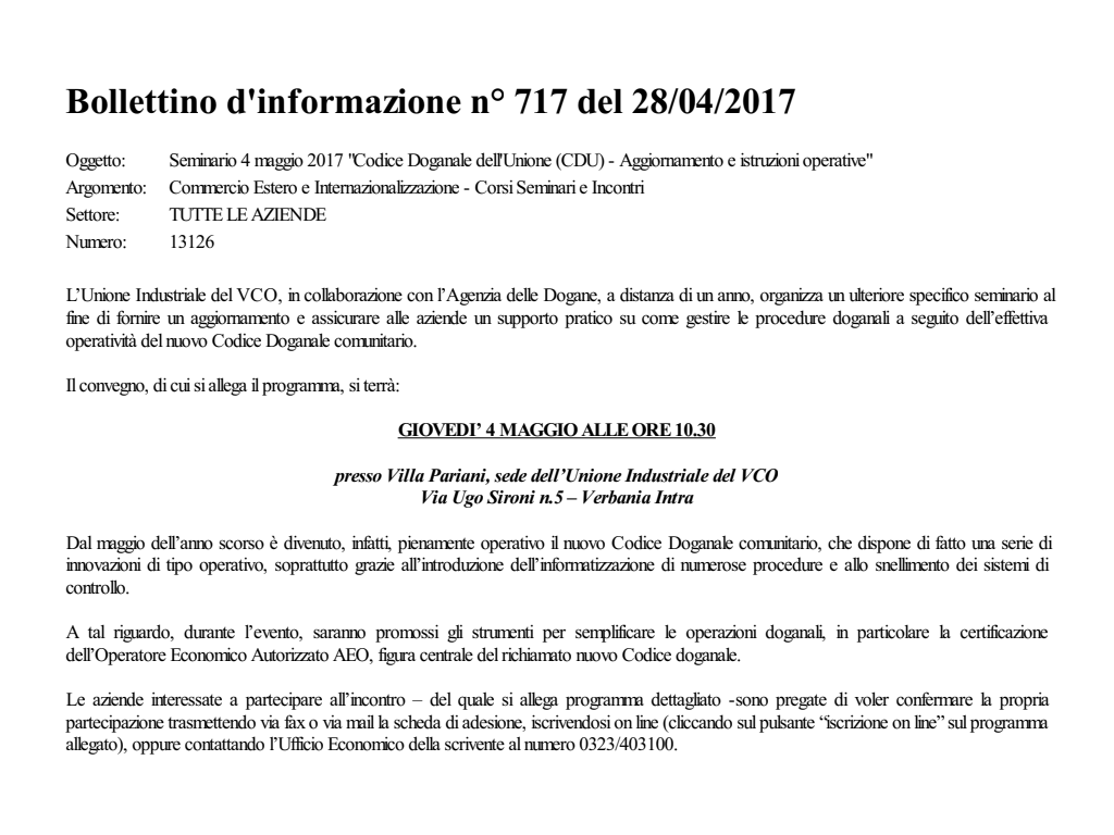 Seminario 4 maggio 2017 "Codice Doganale dell'Unione (CDU) - Aggiornamento e istruzioni operative"