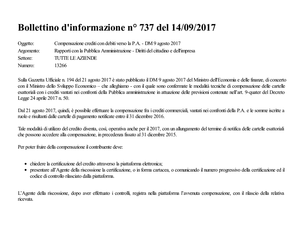 Compensazione crediti con debiti verso la P.A. - DM 9 agosto 2017