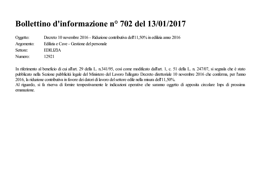 Decreto 10 novembre 2016 - Riduzione contributiva dell'11,50% in edilizia anno 2016