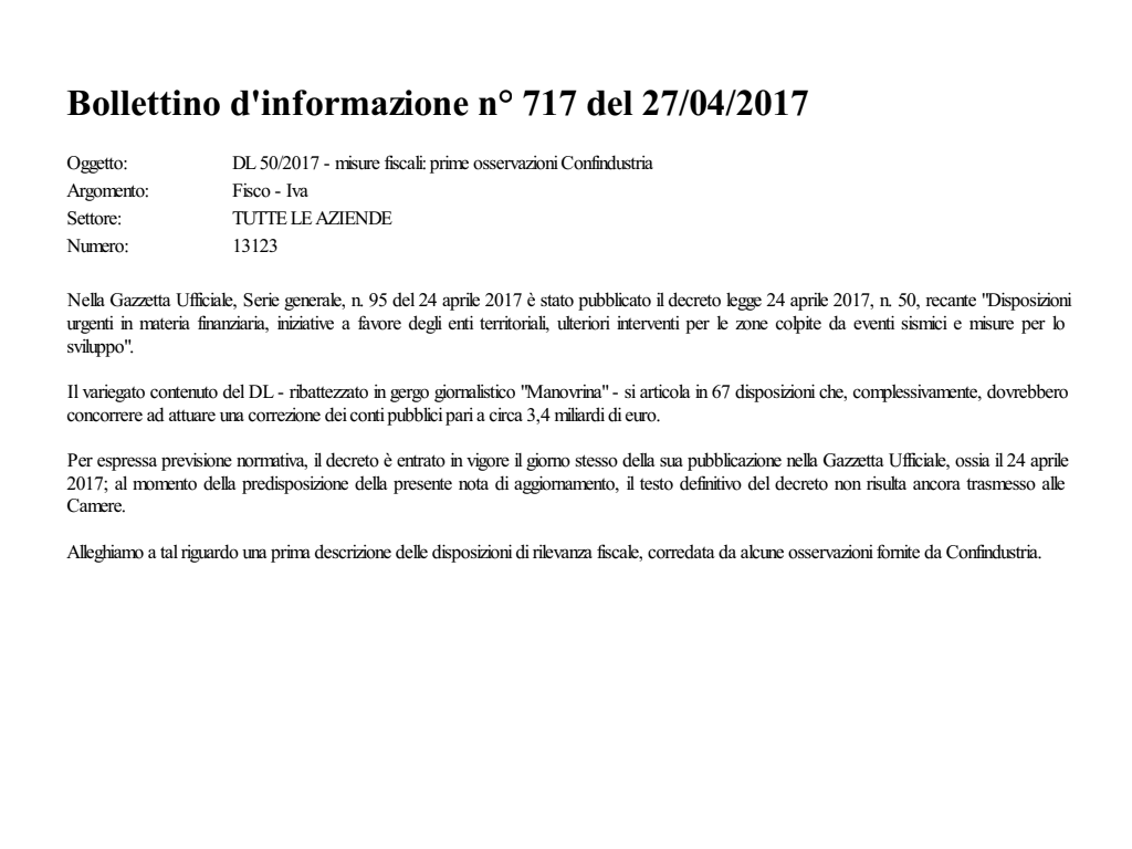 DL 50/2017 - misure fiscali: prime osservazioni Confindustria