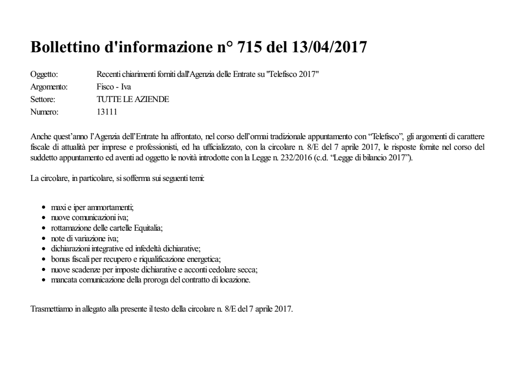 Recenti chiarimenti forniti dall'Agenzia delle Entrate su "Telefisco 2017"