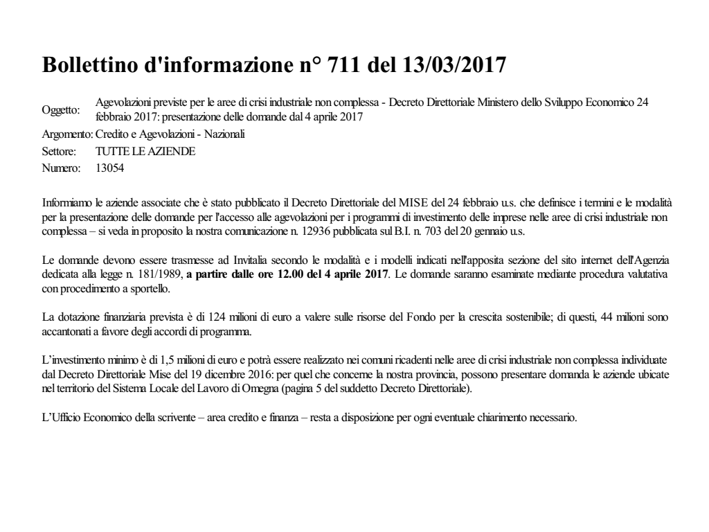 Agevolazioni previste per le aree di crisi industriale non complessa - Decreto Direttoriale Ministero dello Sviluppo Economico 24 febbraio 2017: presentazione delle domande dal 4 aprile 2017