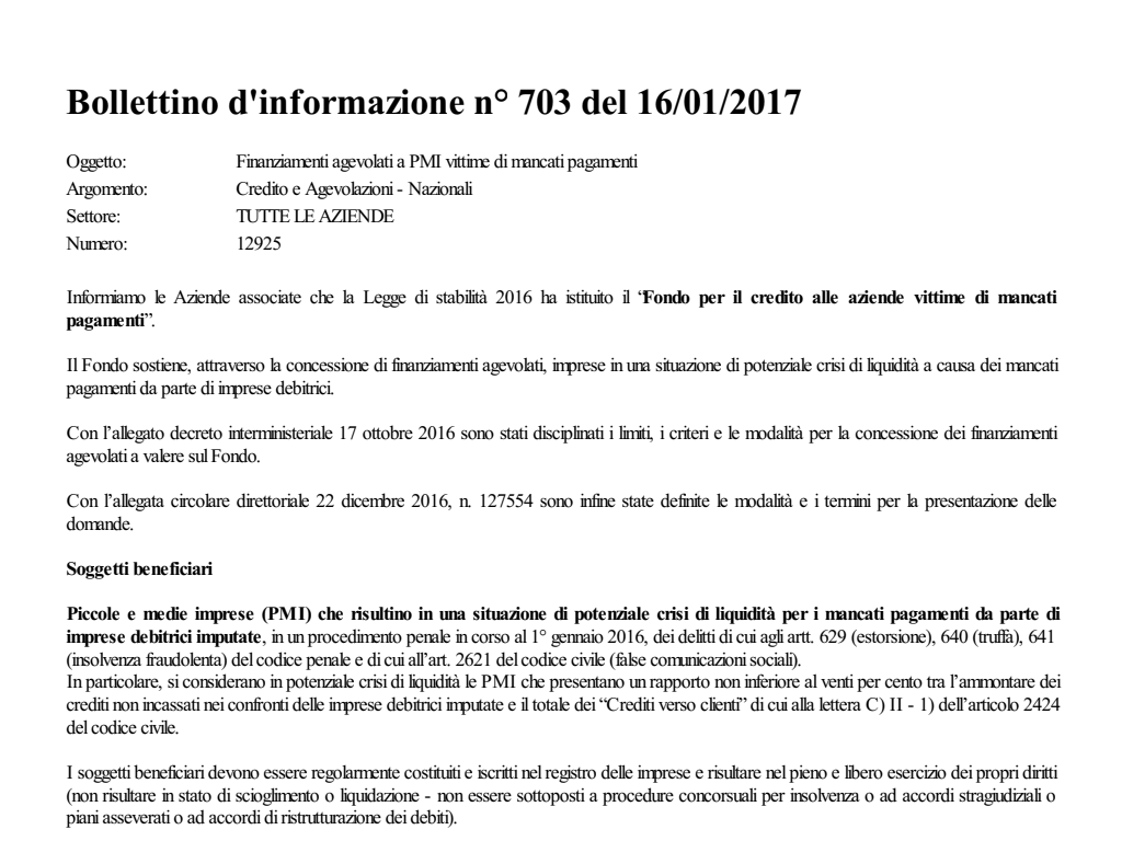 Fondo per il credito alle aziende vittime di mancati pagamenti - Legge di stabilità 2016 - apertura procedura telematica compilazione domande di finanziamento