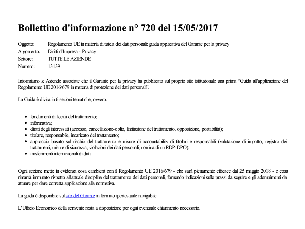 Regolamento UE in materia di tutela dei dati personali: guida applicativa del Garante per la privacy