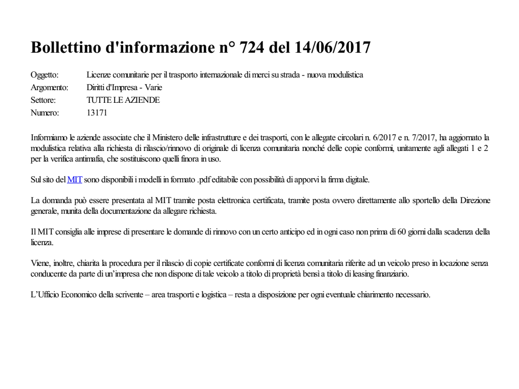 Licenze comunitarie per il trasporto internazionale di merci su strada - nuova modulistica