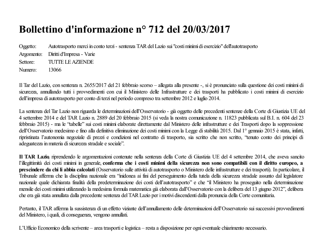 Autotrasporto merci in conto terzi - sentenza TAR del Lazio sui "costi minimi di esercizio" dell'autotrasporto